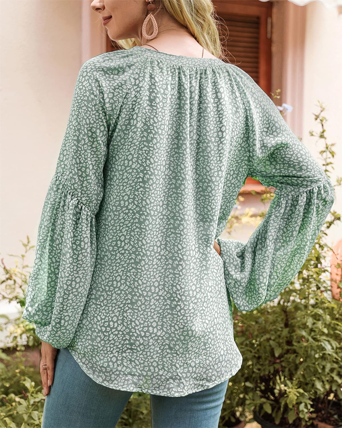 BTFBM Women Casual Boho Floral Blouse Shirts V Neck Long Puff Sleeve Lightweight Chiffon Spring Summer Fashion 2023 Tops(Leopard Green)