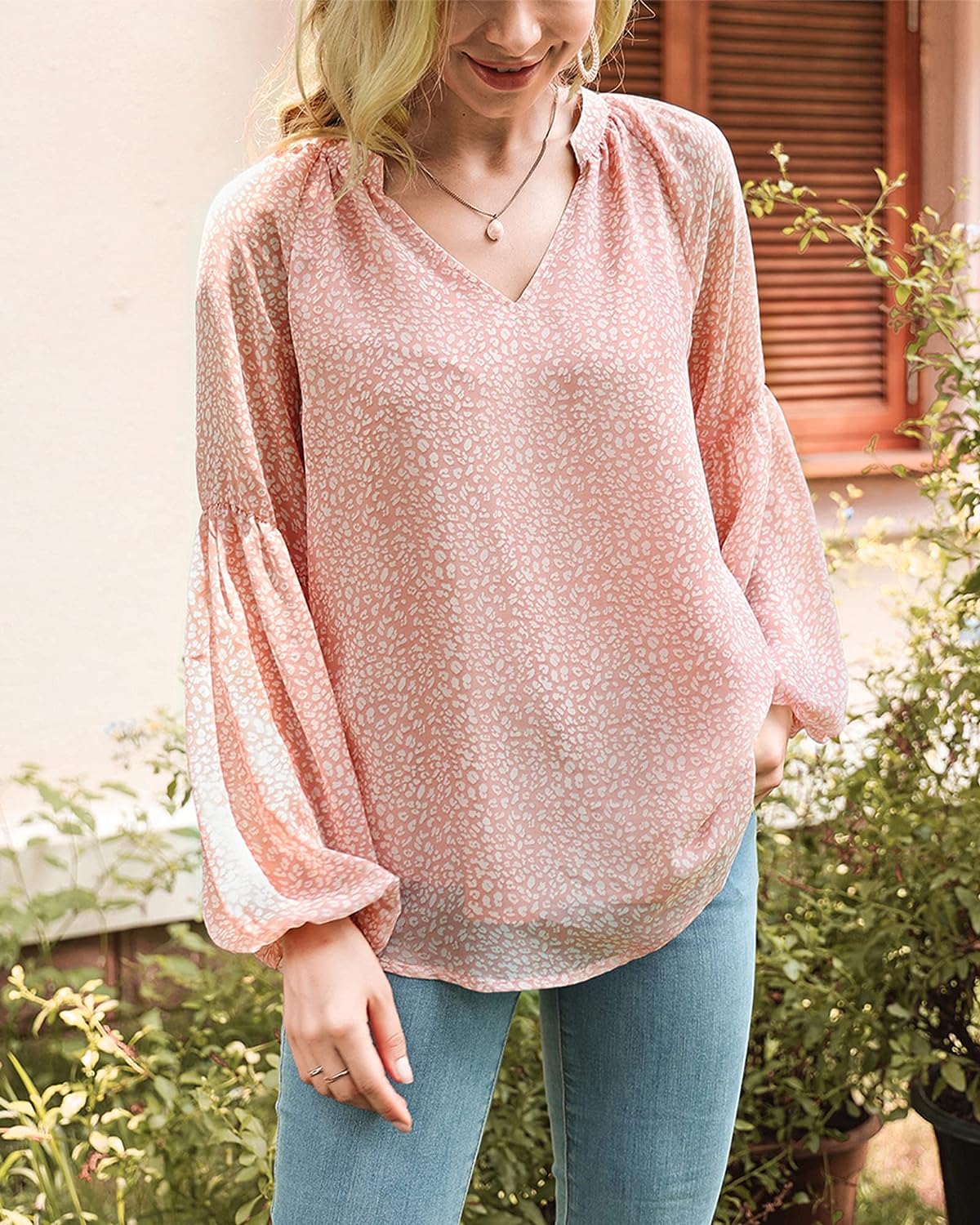 BTFBM Women Casual Boho Floral Blouse Shirts V Neck Long Puff Sleeve Lightweight Chiffon Spring Summer Fashion 2023 Tops(Leopard Pink)