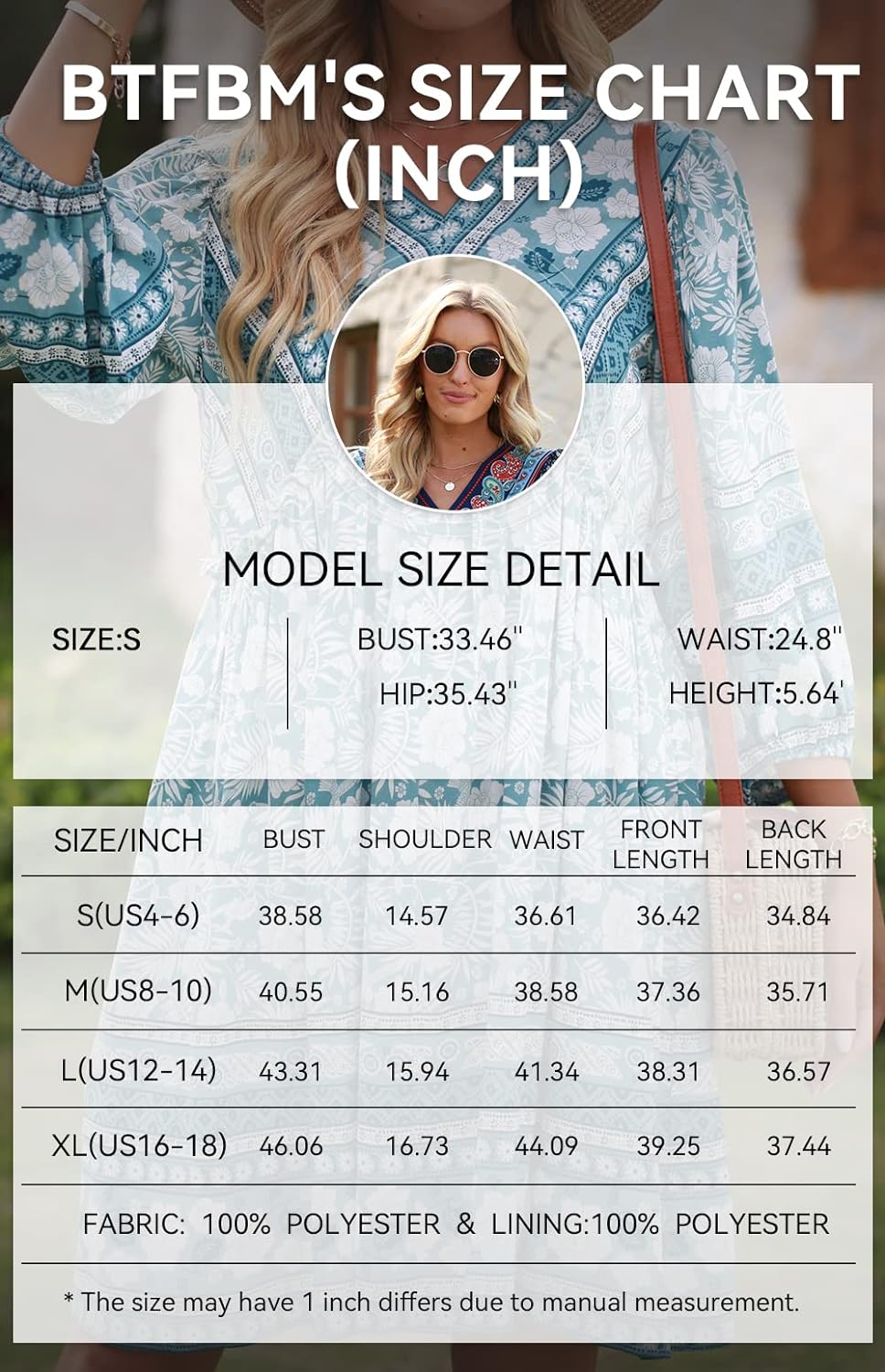 FEATURES: Size: S=US 4-6,M=US 8-10,L=US 12-14,XL=US 16-18 / Casual Spring Dress For Women / Summer Boho Dress / Women Beach Dresses / Short Mini Dresses / V Neck / 3/4 Balloon Sleeves With Elastic Cuff / Ruffle Hem Around Chest Area / Swing Flare A-Line / Pretty Floral Print / Loose Fit Cut / Knee Length