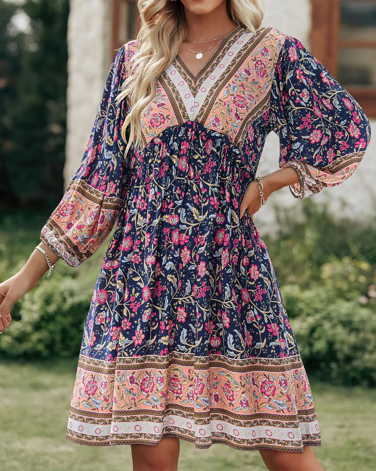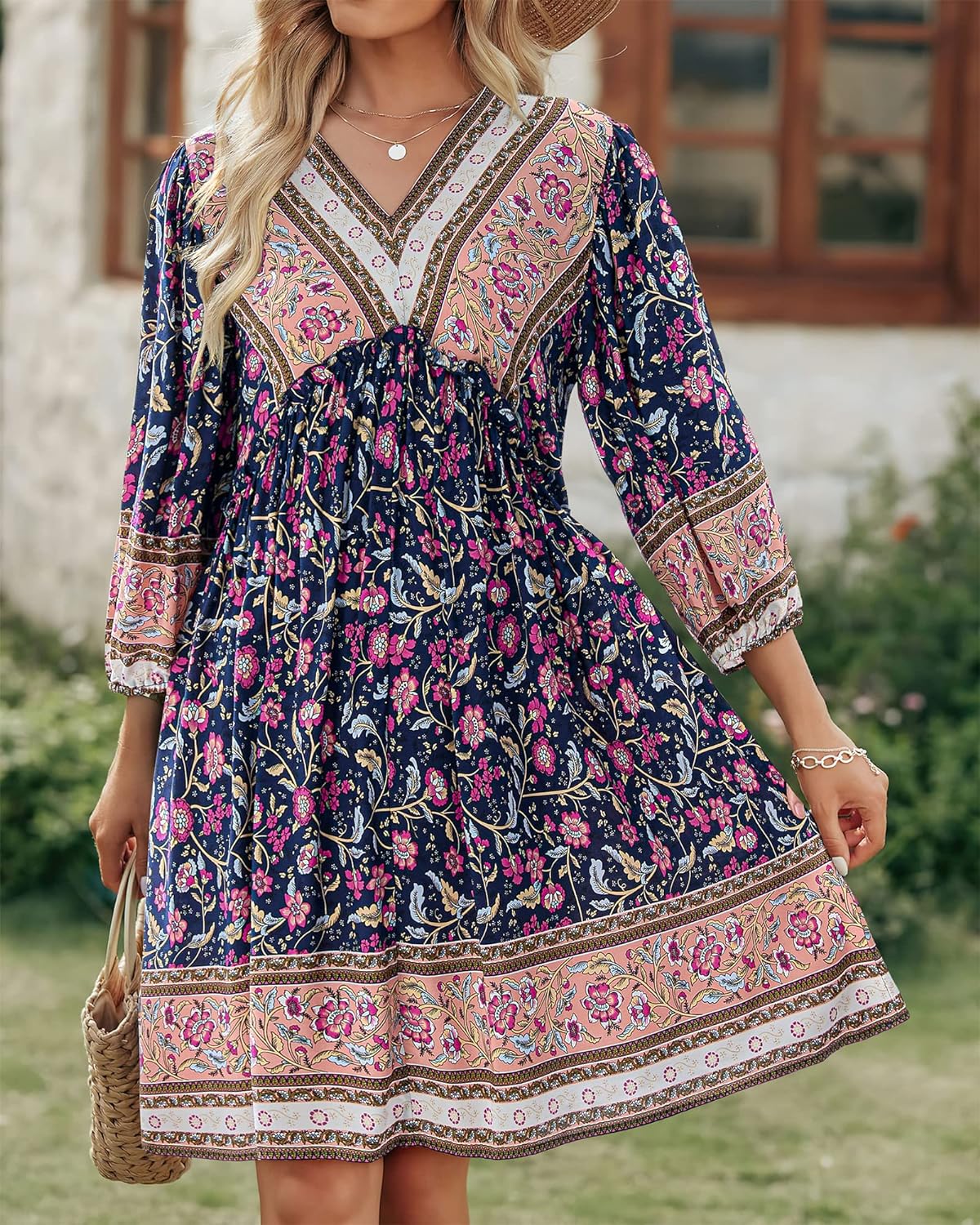 BOHEMIAN SUMMER DRESS FOR WOMEN: This Fashion Short Sleeve Dress With Feminine V Neck, Which Can Show Your Sexy And Charming Neckline And Clavicle Fully. Loose Fit 3/4 Balloon Sleeve End With Elastic Cuffs Can Cover Your Arms, Perfectly To Hide Your Flaws And Modify Arm Line