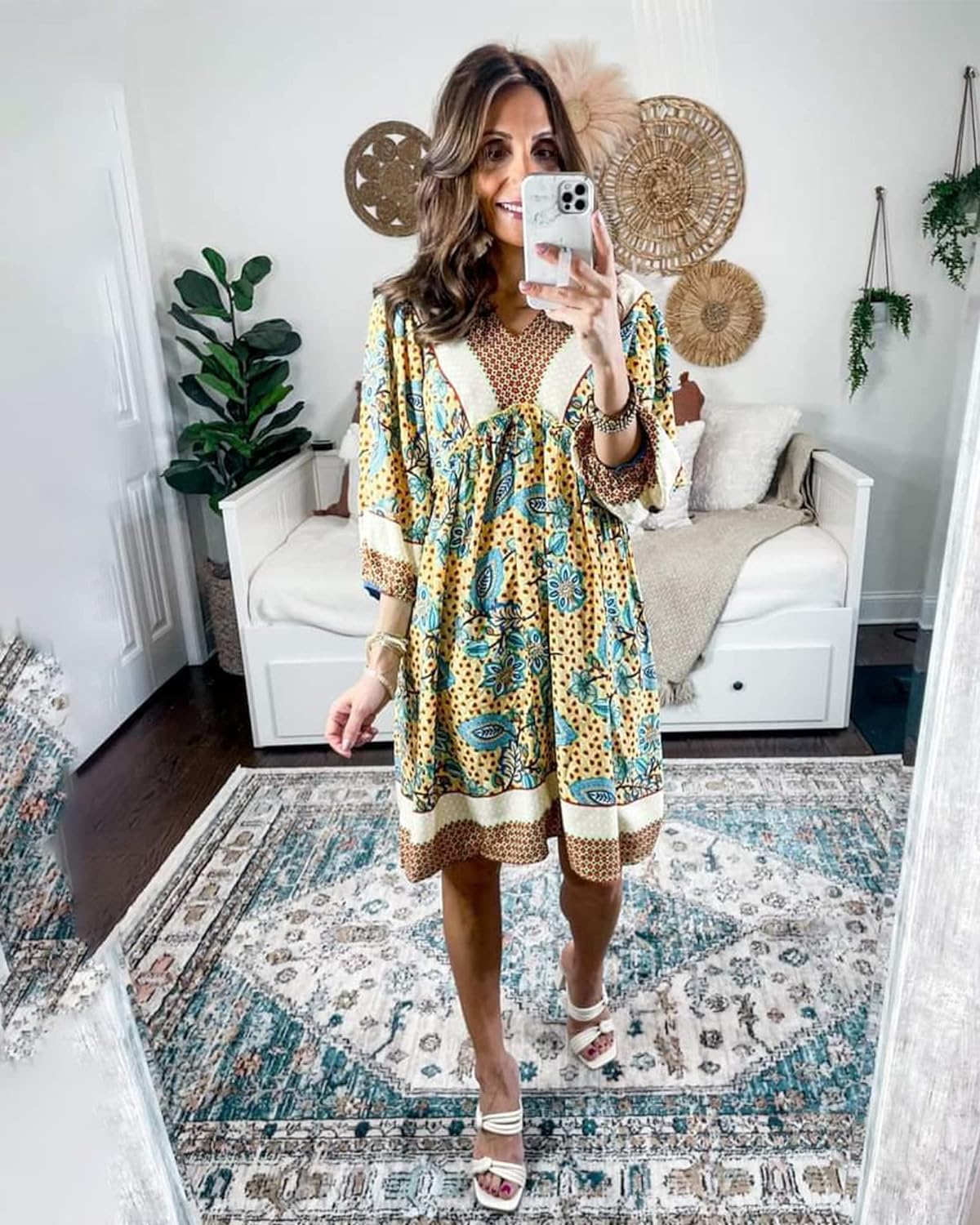 BTFBM Women Casual Spring Summer Dresses V Neck 3/4 Long Sleeve Ruffle Floral Flowy Boho Babydoll Mini Short Beach Dress(Floral Yellow Apricot)