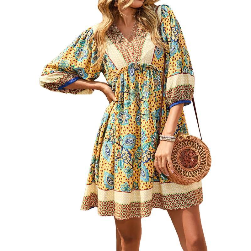 BOHEMIAN SUMMER DRESS FOR WOMEN: This Fashion Short Sleeve Dress With Feminine V Neck, Which Can Show Your Sexy And Charming Neckline And Clavicle Fully. Loose Fit 3/4 Balloon Sleeve End With Elastic Cuffs Can Cover Your Arms, Perfectly To Hide Your Flaws And Modify Arm Line