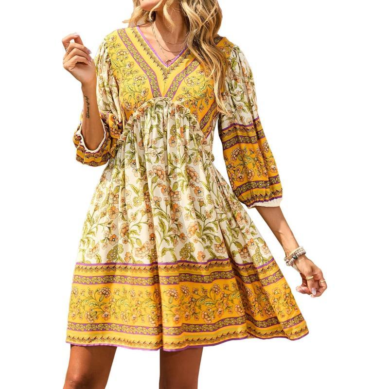 FEATURES: Size: S=US 4-6,M=US 8-10,L=US 12-14,XL=US 16-18 / Casual Spring Dress For Women / Summer Boho Dress / Women Beach Dresses / Short Mini Dresses / V Neck / 3/4 Balloon Sleeves With Elastic Cuff / Ruffle Hem Around Chest Area / Swing Flare A-Line / Pretty Floral Print / Loose Fit Cut / Knee Length