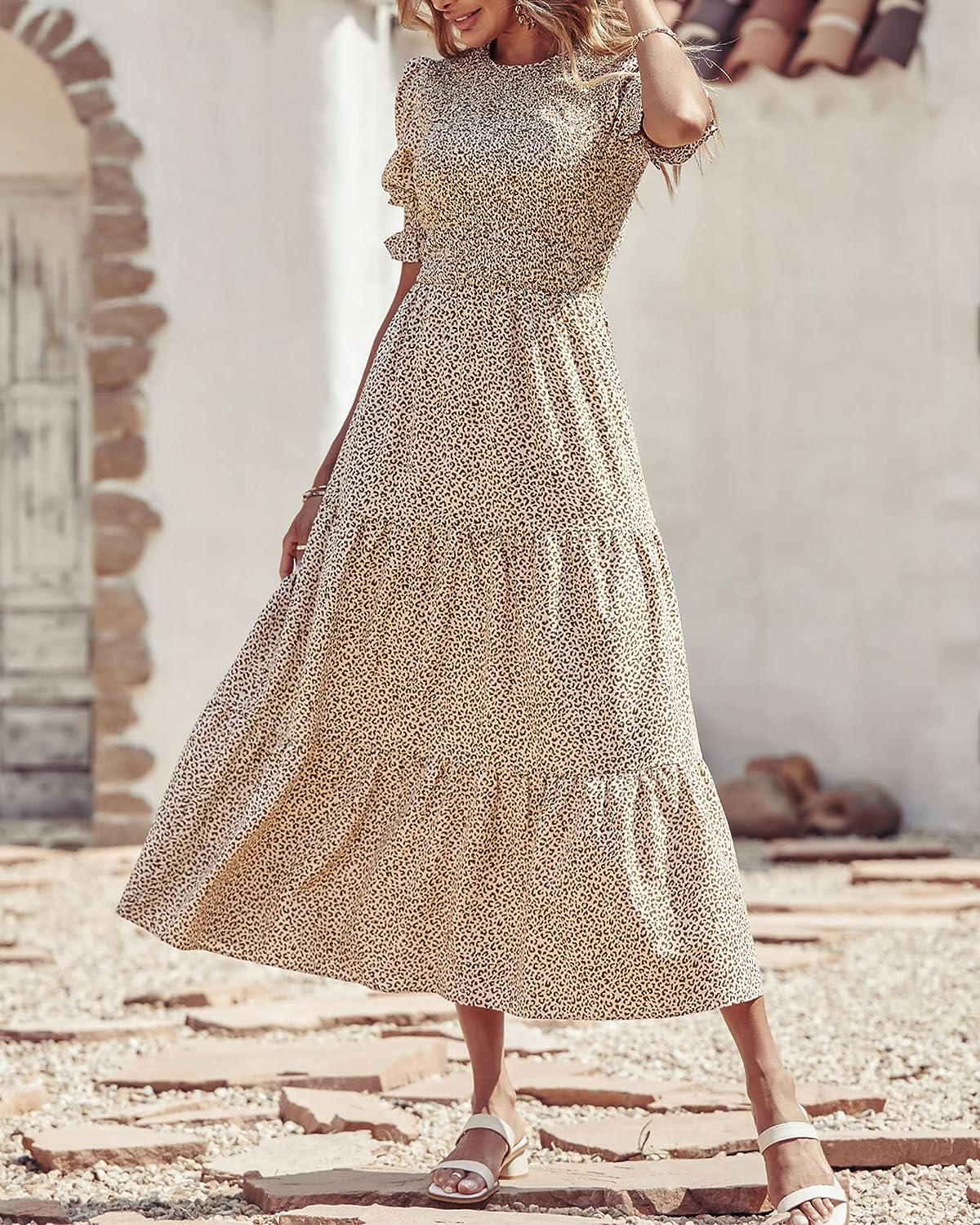 FEATURES: Size: S=US 4-6,M=US 8-10,L=US 12-14,XL=US 16-18 / Summer Dresses For Women 2023 / Maxi Dress For Women / Spring Dresses For Women / Boho Dress For Women / Crew Neck / Short Puff Sleeves With Elastic Ruffle Cuff / Stretchy Smocked Bodice (Smocking At Bust And Waist) / Pattern: Floral And Leopard Print / Tiered Flare A- Line / Pleated Hem / Swing And Flowy