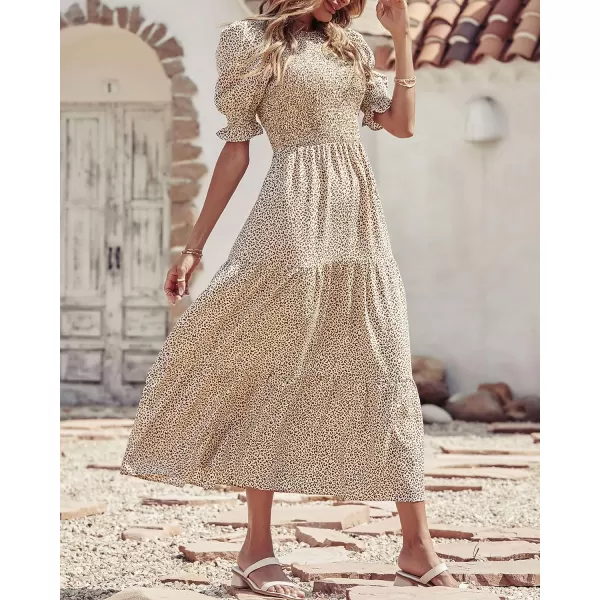 BTFBM Women Casual Summer Dresses 2023 Spring Crew Neck Ruffle Short Sleeve Floral Leopard Smocked Boho Flowy Maxi Dress(Dot Apricot Coffee)