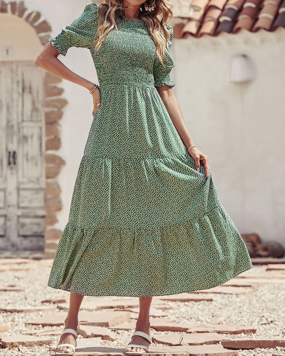 BTFBM Women Casual Summer Dresses 2023 Spring Crew Neck Ruffle Short Sleeve Floral Leopard Smocked Boho Flowy Maxi Dress(Dot Green White)