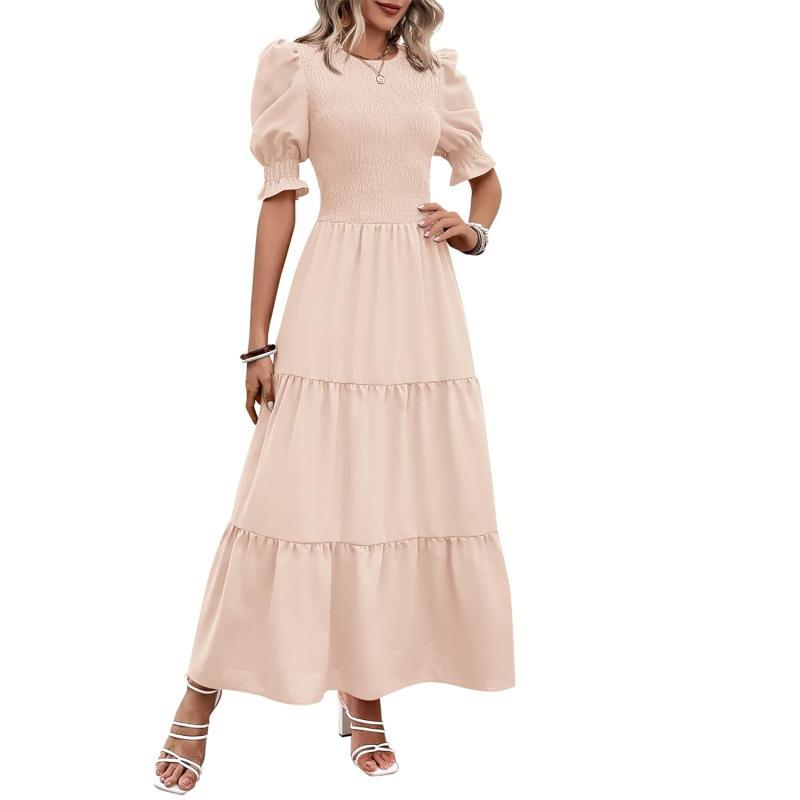 BTFBM Women Casual Summer Dresses 2023 Spring Crew Neck Ruffle Short Sleeve Floral Print Smocked Boho Flowy Maxi Dress(Solid Beige)