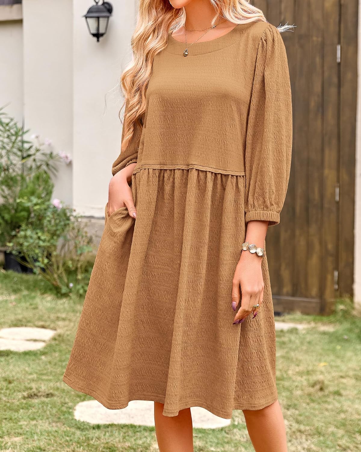 BTFBM Women Casual Summer Dresses 2024 Crew Neck 3/4 Puff Sleeve Tunic Dress Textured Loose Flowy Mini Babydoll Dress(Solid Light Brown)