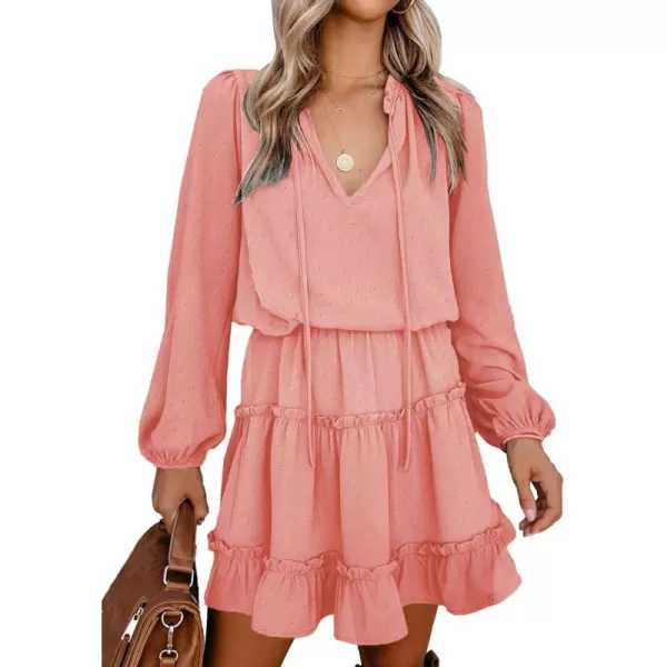 BTFBM Women Casual Summer Fall Dresses Tie V Neck Long Sleeve High Waist Ruffle Tiered A Line Swing Tunic Mini Dress(Dot Pink)