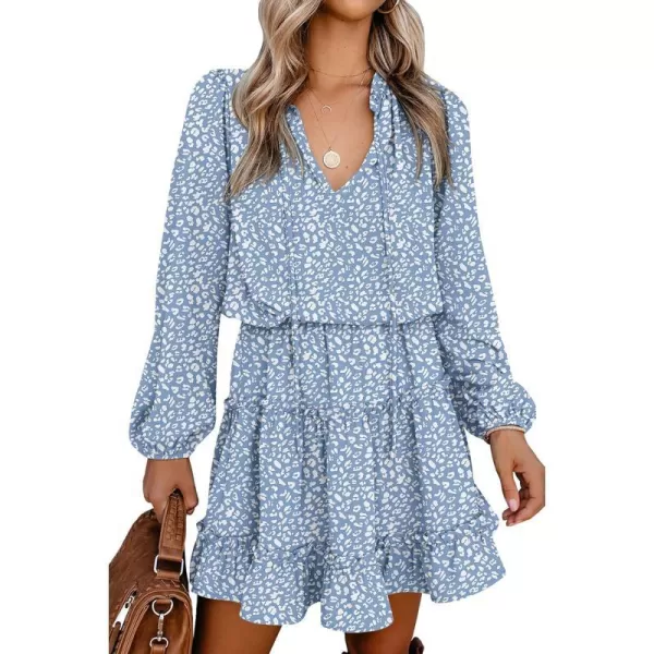 imageBTFBM Women Casual Summer Fall Dresses Tie V Neck Long Sleeve High Waist Ruffle Tiered A Line Swing Tunic Mini DressDot Navy