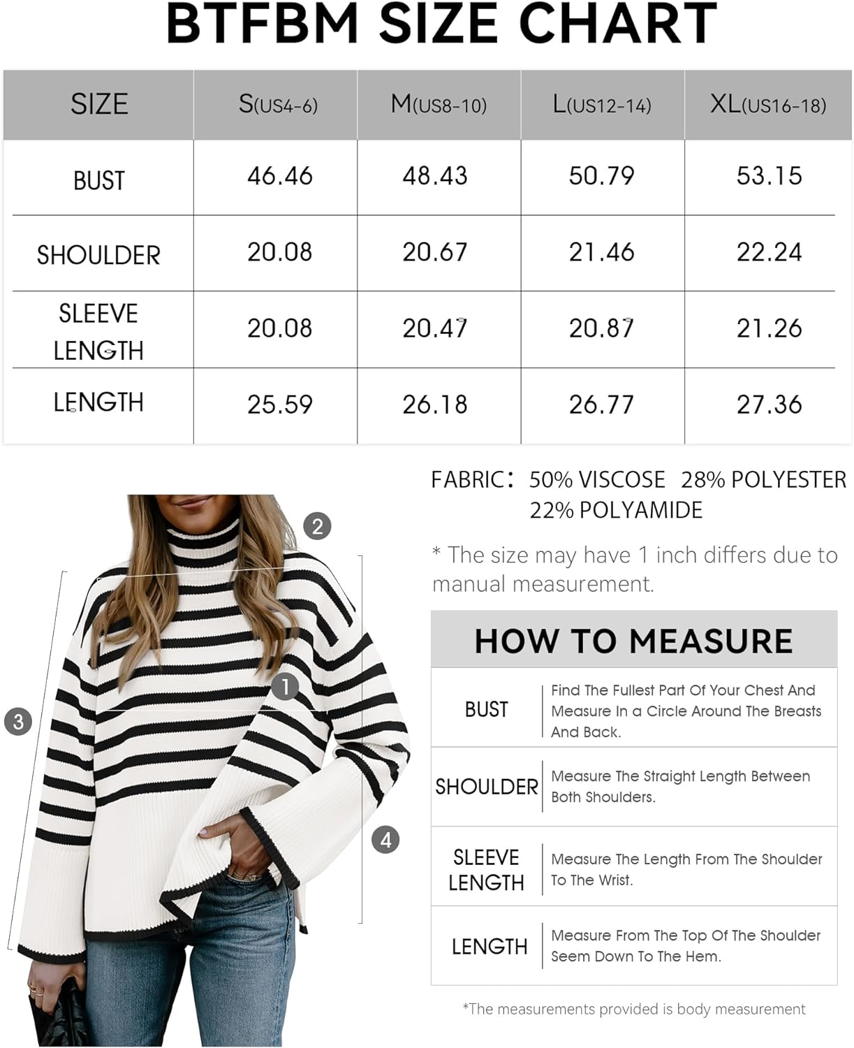 imageBTFBM Women Casual Turtleneck Striped Sweater 2023 Fall Winter Jumper Tops Long Sleeve Side Slit Oversized Knit PulloverStriped White
