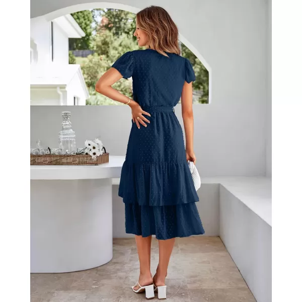 BTFBM Women Casual V Neck Dresses Boho Short Sleeve Chiffon Swiss Dot Belted Ruffle Wrap 2023 Summer Wedding Party Dress(Swiss Dot Dark Blue)