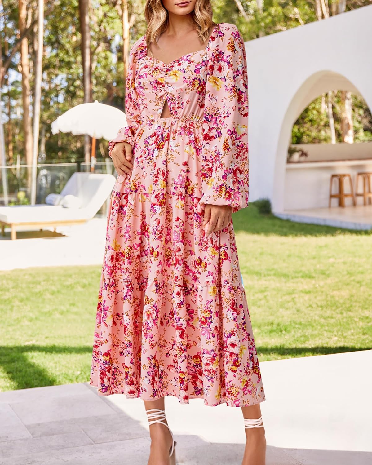 FEATURES: S=US 4-6, M=US 8-10, L=US 12-14, XL=US 16-18, XXL=US 20 / Floral Maxi Dress / Puff Sleeve Dress / Square Neck / Long Sleeve With Elastic Cuff / Cut Out Detail At Front / Elastic High Waist / Smocked Back / Tiered Ruffle Hem / Flowy A-Line Shape / With Lining