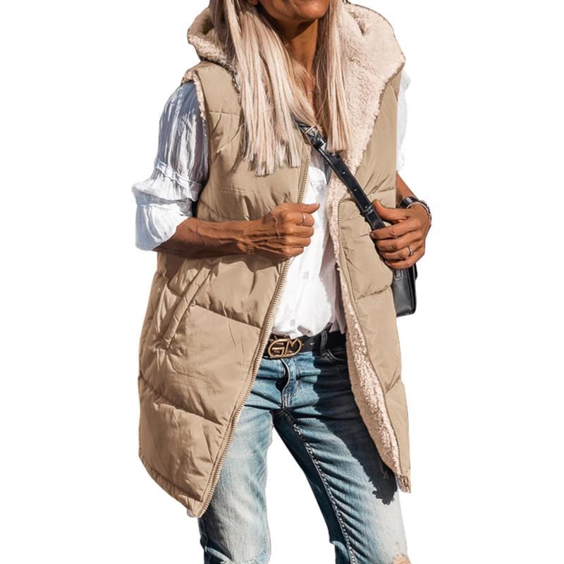 BTFBM Women Fall Reversible Vests Sleeveless Sherpa Fleece Jacket Zip Up Hoodie Long Warm Winter Padded Coat Outerwear(Solid Light Khaki)