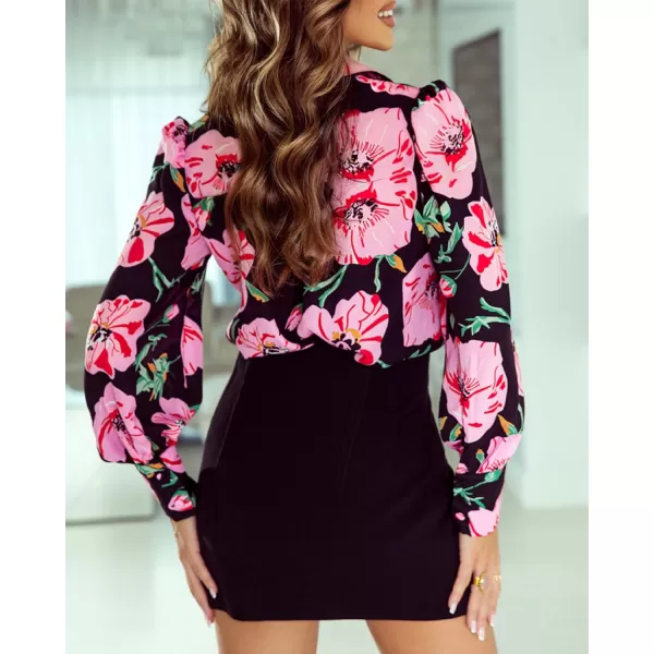 BTFBM Women Fashion Button Down Shirts Lapel V Neck Printed Casual Long Sleeve Blouse Boho Dressy Summer Fall Tops 2023(Big Floral Black Pink)