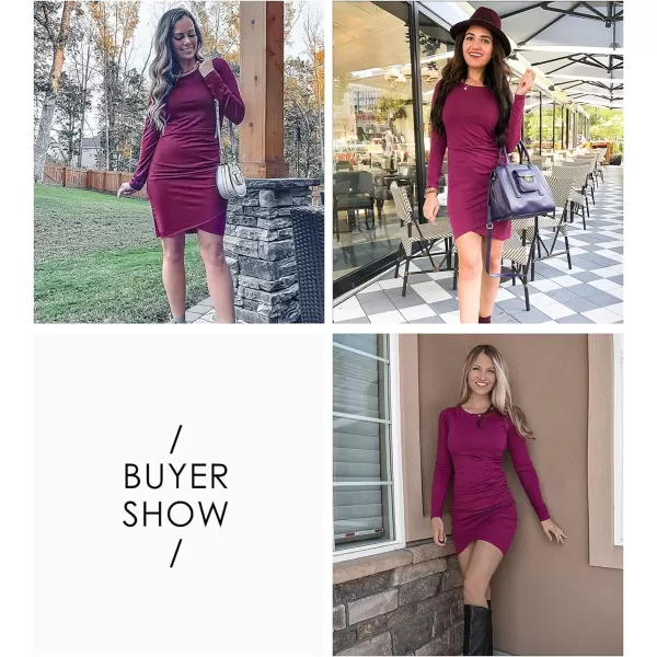 BTFBM Women Fashion Ruched Elegant Bodycon Long Sleeve Wrap Front Solid Color Casual Basic Fitted Short Dresses(Rose Red)