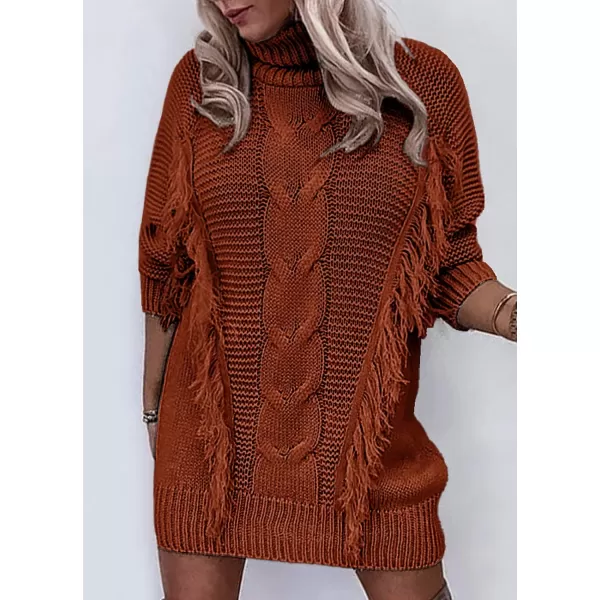 BTFBM Women Fashion Sweater Short Dress Long Sleeve Turtleneck Oversized Fall Winter Soft Chunky Knit Pullover Sweaters(Tassel Caramel)