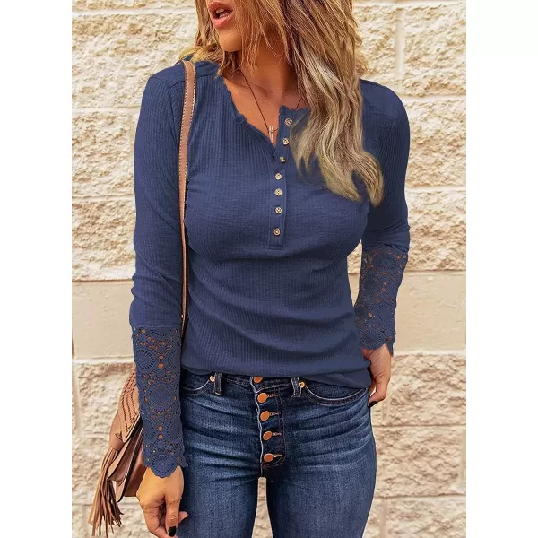 BTFBM Women Long Sleeve V Neck Button Up Solid Tops Blouses Trendy Slim Fit Lace Sleeves Ribbed Knit Casual Shirts Tunic(Lace Navy)