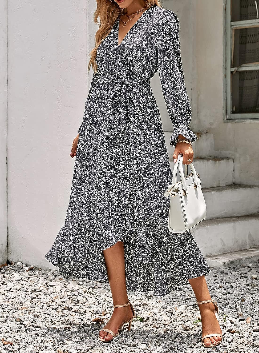 FEATURES: Size: S=US 4-6, M=US 8-10, L=US 12-14, XL=US 16-18, XXL=US 20-22 / Womens Summer Dress / Casual Wrap Dress / Spring Dress For Women / Long Sleeve With Ruffle Cuffs / Cross V Neck With Safety Button / High Waist / Self Tie Belt At The Waist / Pleated Wrap High Low Hem / Flowy A-Line / Delicate Floral Print / Homecoming Dresses / Long Dresses For Women