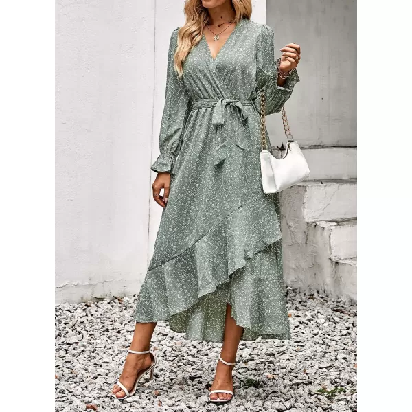 imageBTFBM Women Long Sleeve Wrap Maxi Dress V Neck Boho Floral High Waist Flowy Ruffle 2023 Summer Fall Dresses with BeltFloral Green