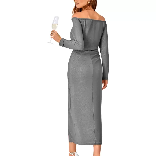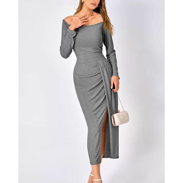 BTFBM Women Off Shoulder Bodycon Dresses Long Sleeve Ruched Slit Glitter Ball Gown Cocktail Party Evening Maxi Dress(Shiny Grey)
