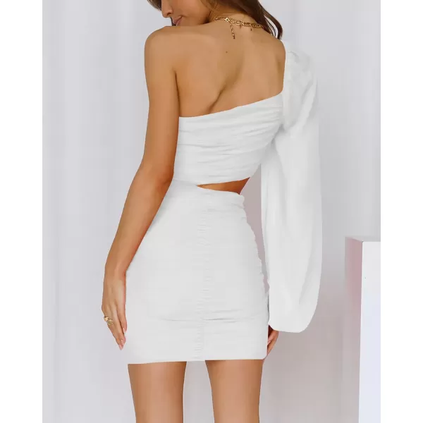 imageBTFBM Women One Shoulder Ruched Bodycon Mini Dress Puff Long Sleeve 2023 Spring Summer Club Party Cocktail Short DressesZwhite