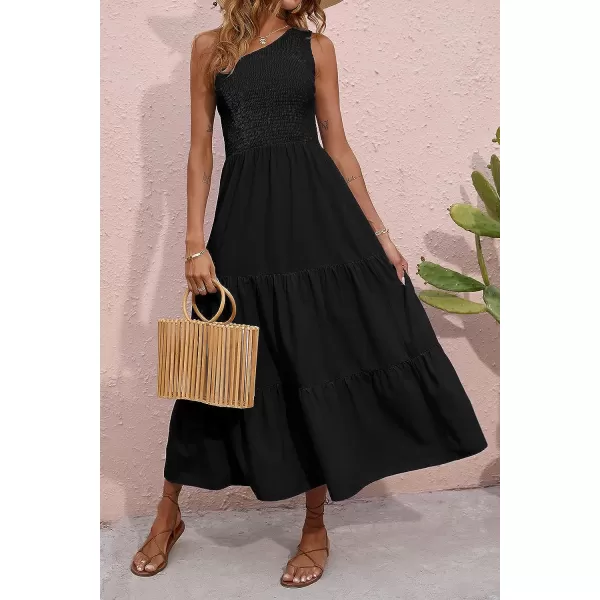 BTFBM Women One Shoulder Sleeveless Casual Summer Dresses 2023 Smocked High Waist Floral Flowy Beach Boho Maxi Dress(Solid Black)