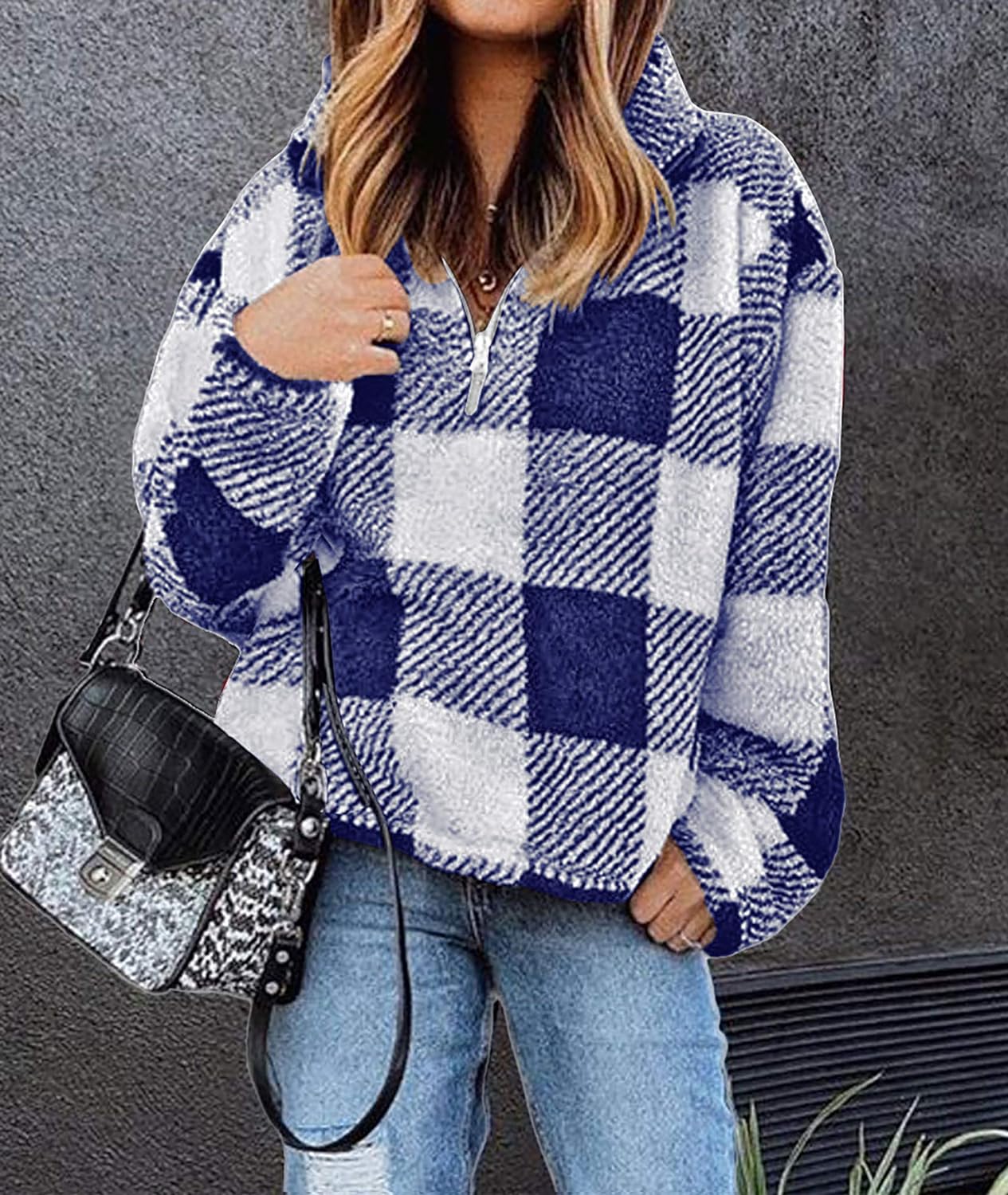 BTFBM Women Sherpa Pullover Quarter Zip Long Sleeve Fluffy Soft Fleece Jackets Sweaters Sweatshirts Hoodies Outwear Coat(Plaid Blue)