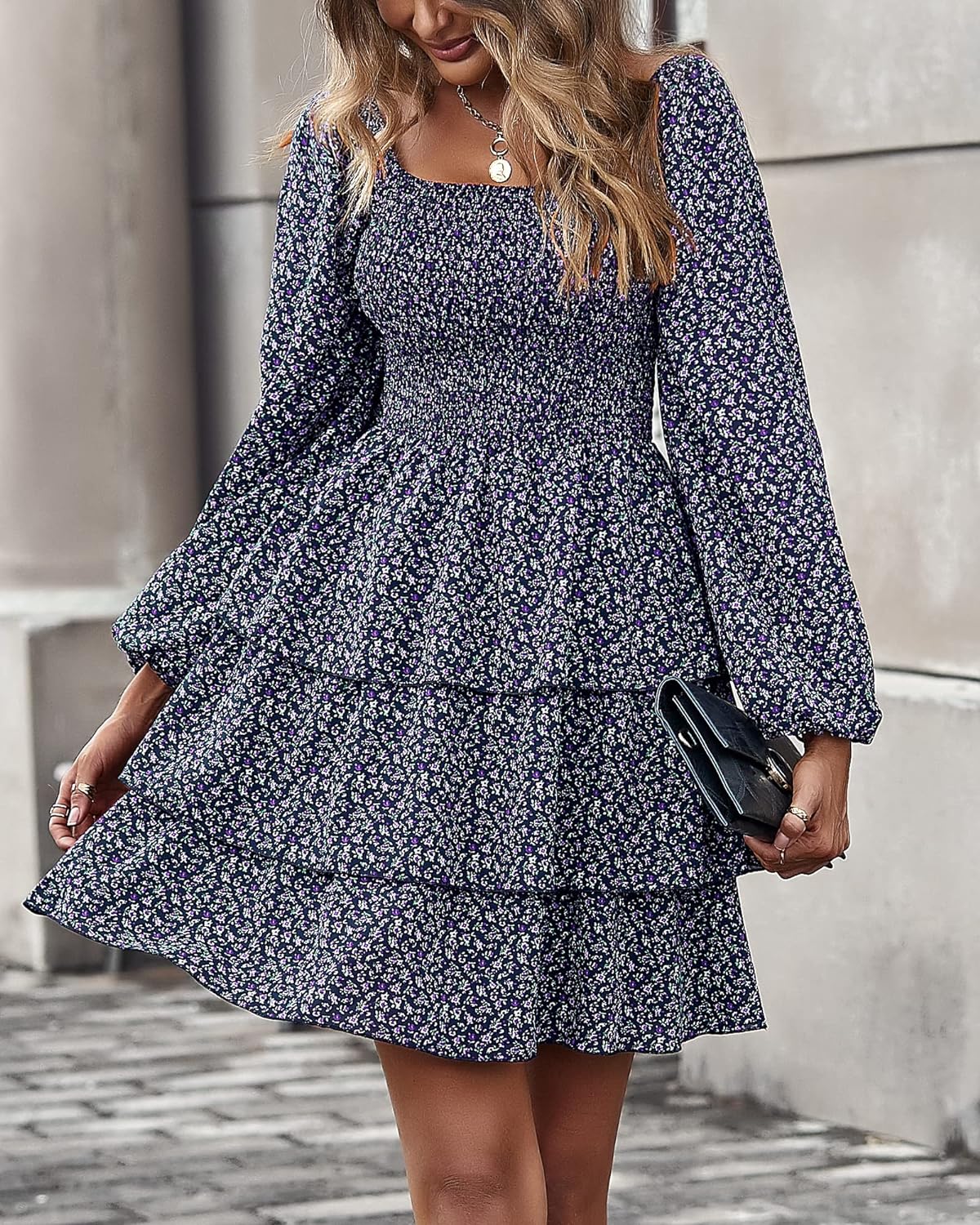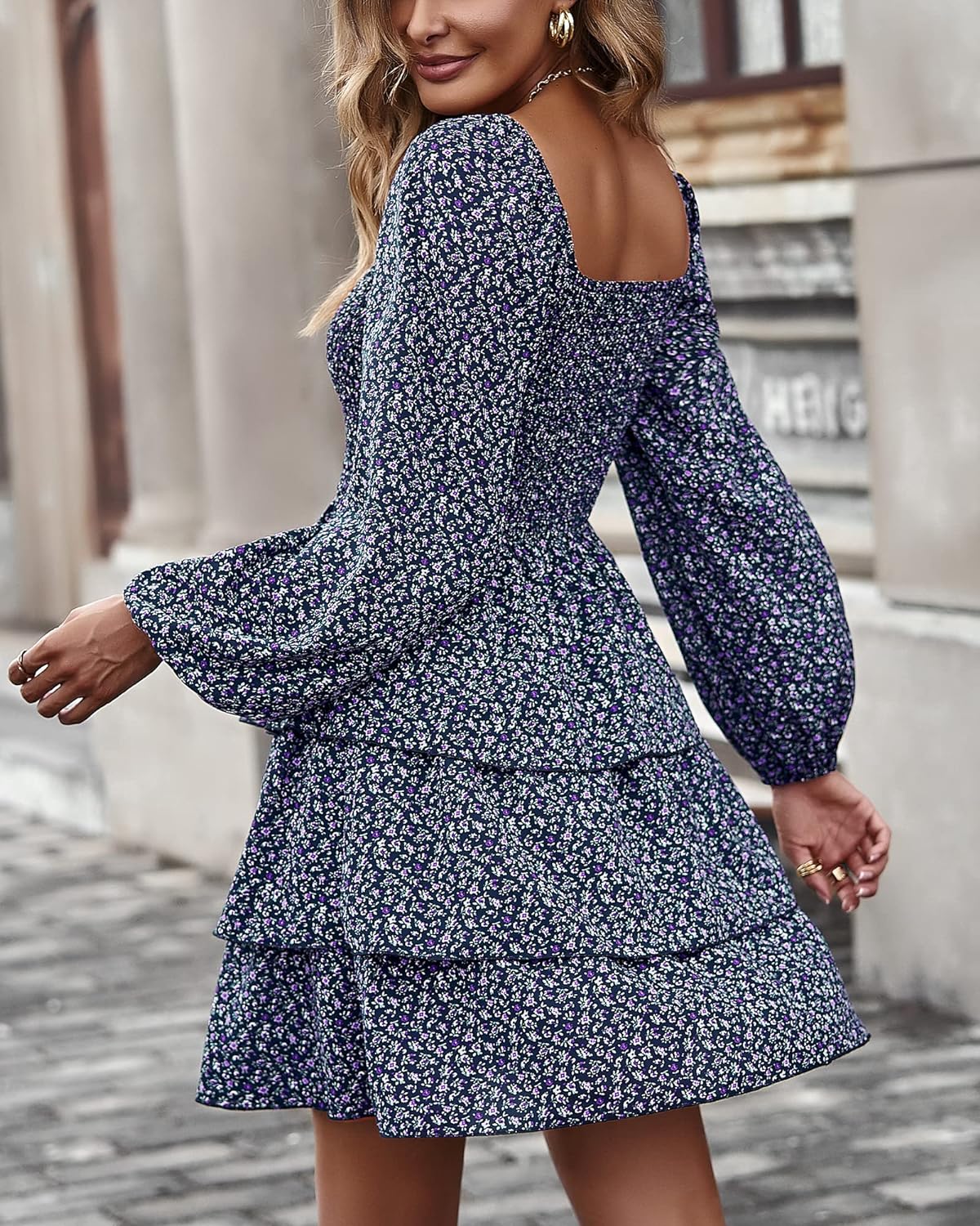 WOMEN FLORAL PRINT DRESS WITH A WOW FACTOR: It Beautifully Outline Your Silhouette Thanks To The Stretchy Smocked Bust And Waist Design. In Addition To The Elegant Square Neckline, The Wide Long Sleeves With Elastic Cuffs, And Has The Flared Skirt With A Layered Flounces Hem Are Also Impressive