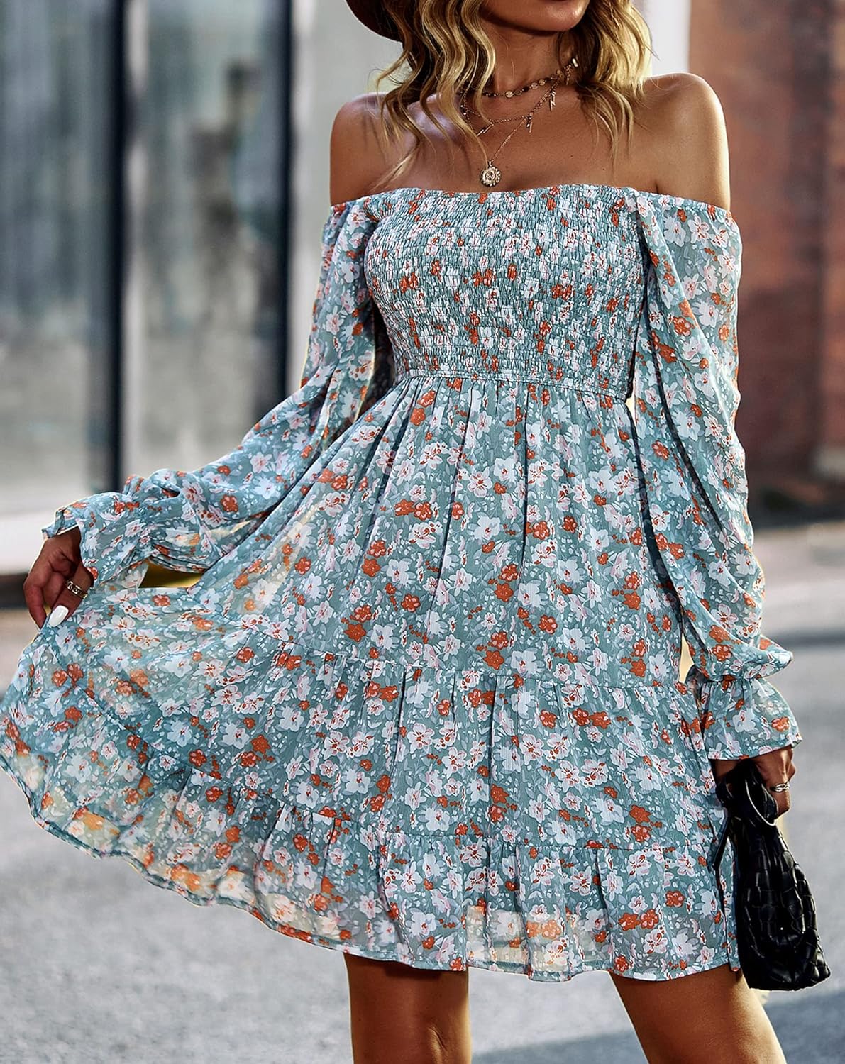 WOMEN FLORAL PRINT DRESS WITH A WOW FACTOR: It Beautifully Outline Your Silhouette Thanks To The Stretchy Smocked Bust And Waist Design. In Addition To The Elegant Square Neckline, The Wide Long Sleeves With Elastic Cuffs, And Has The Flared Skirt With A Layered Flounces Hem Are Also Impressive