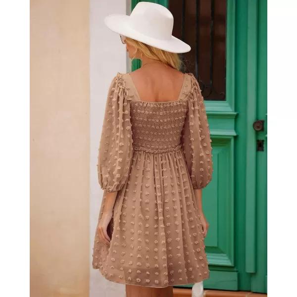 imageBTFBM Women Square Neck Smocked Summer Fall Dresses 2023 Long Sleeve Floral Swiss Dot Ruffle Party Mini Babydoll DressSwiss Dot Khaki