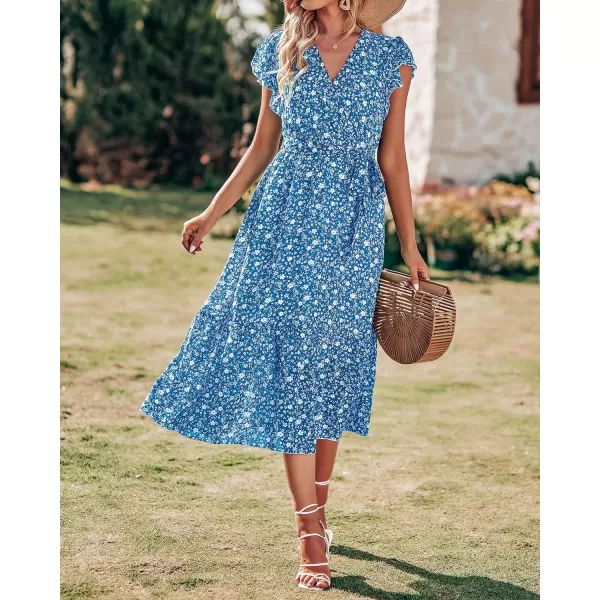 BTFBM Women Summer Bohemian Floral Casual Wrap V Neck Ruffle Cap Sleeveless Belt A-Line Pleated Hem Swing Midi Sun Dress(Floral White Blue)