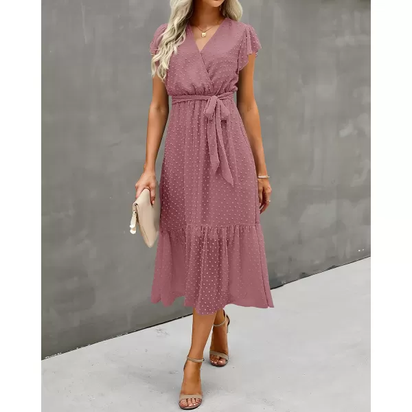 BTFBM Women Summer Bohemian Floral Casual Wrap V Neck Ruffle Cap Sleeveless Belt A-Line Pleated Hem Swing Midi Sun Dress(Swiss Dot Bean Paste Red)