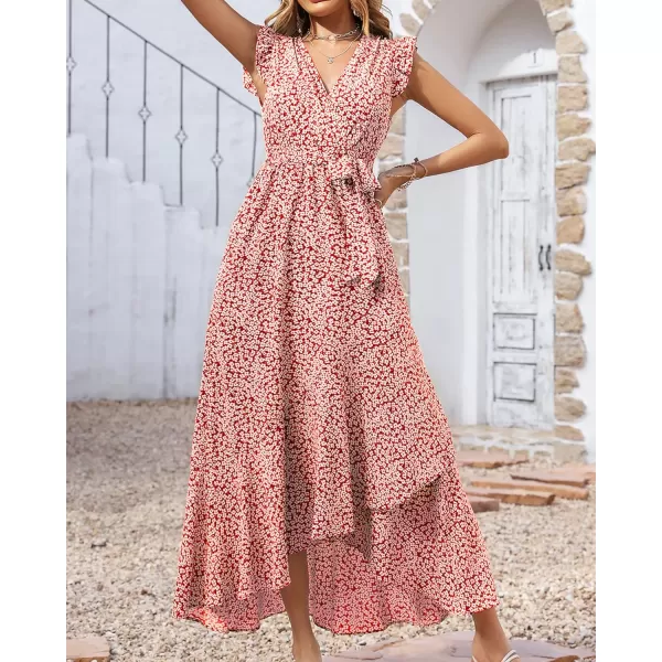 BTFBM Women Summer Dresses 2023 Ruffle Cap Sleeve V Neck Belt Wrap Split Boho Floral Long Casual Party Beach Maxi Dress(Floral Print Red)