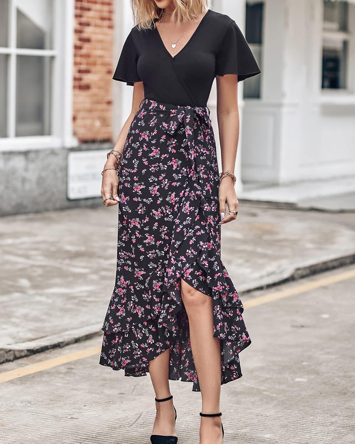 BTFBM Women Summer Long Dresses 2023 Short Sleeve V Neck Boho Floral Print Tie Waist High Low Ruffle Cocktail Maxi Dress(Floral Black Red)