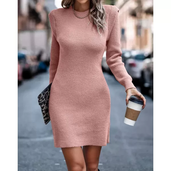 BTFBM Women Sweater Bodycon Short Dress Long Sleeve Crew Neck Slim Fit Solid Dressy Fall Winter Mini Ribbed Knit Dresses(Solid Light Pink)