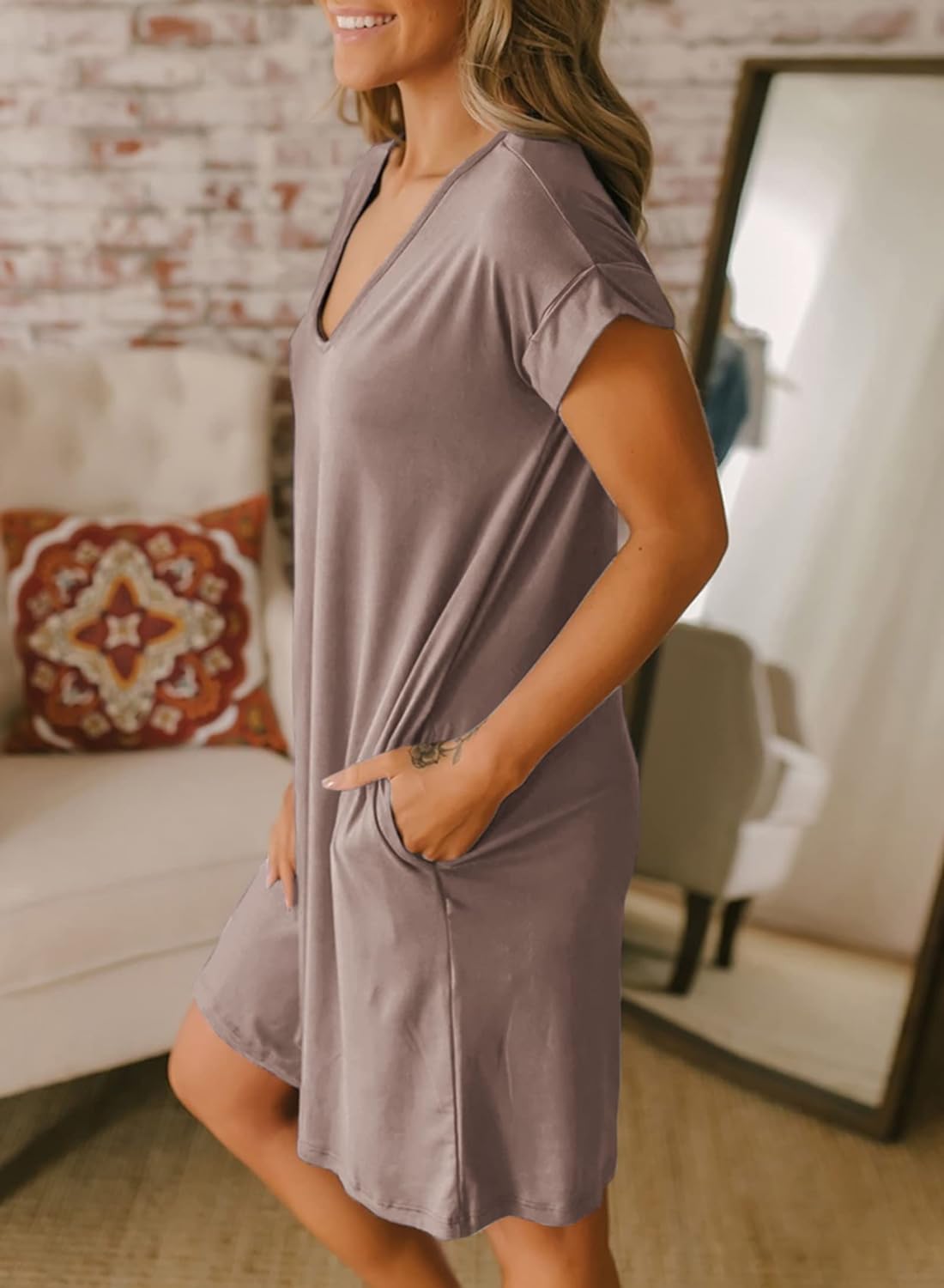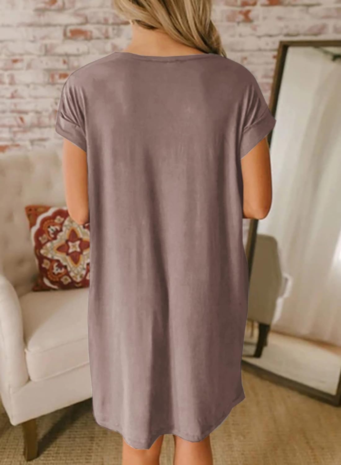 BTFBM Women V-Neck Short Sleeve Summer Dresses 2023 Spring Casual Loose T-Shirt Tunic Short Dress Pajamas with Pockets(Dark Khaki)