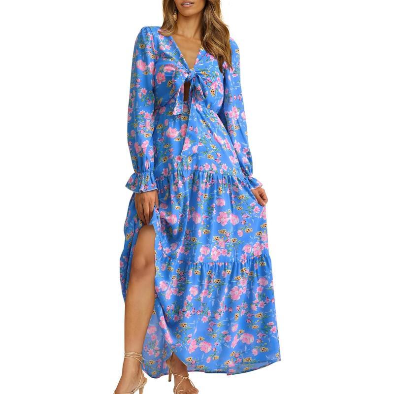 FEATURES: S=US 4-6, M=US 8-10, L=US 12-14, XL=US 16 / Women's Casual Dresses / Fall Dresses For Women / Boho Dresses / Long Sleeve With Ruffle Cuffs / Deep V Neck / Bow Knot Front / Hollow Out / Elastic Waist / Tiered Hem / Delicate Print / Flowy A-Line Dresses