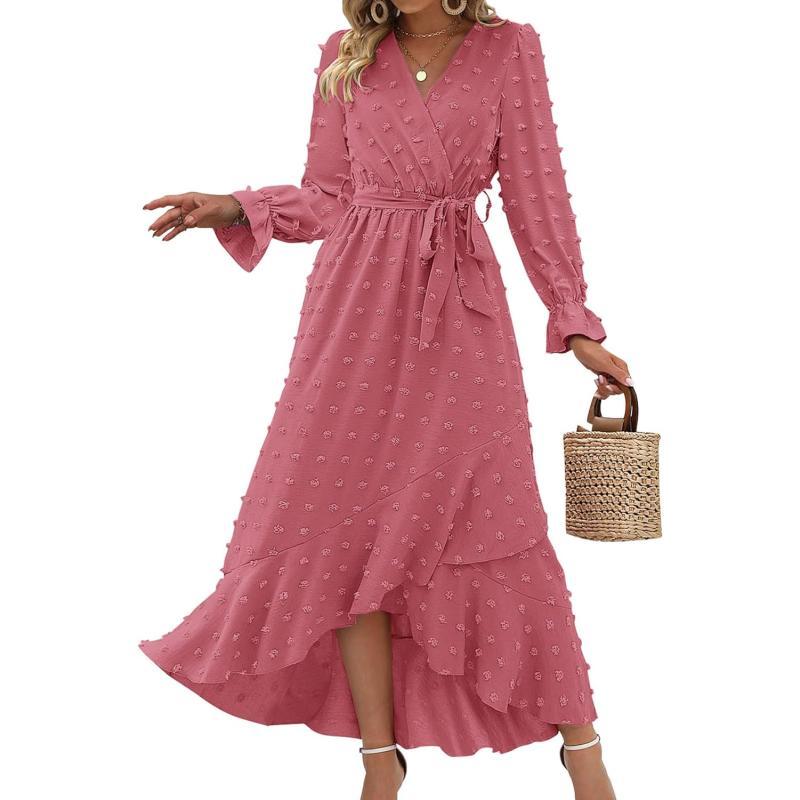 FEATURES: S=US 4-6, M=US 8-10, L=US 12-14, XL=US 16-18, XXL=US 20 / Women's Fall Dresses / Casual A-Line Dresses / Vacation Dresses / Long Sleeve With Ruffle Cuffs / Cross V Neck With Safety Button / Self Tie Belt / Pleated Wrap Hem / 3D Swiss Dot