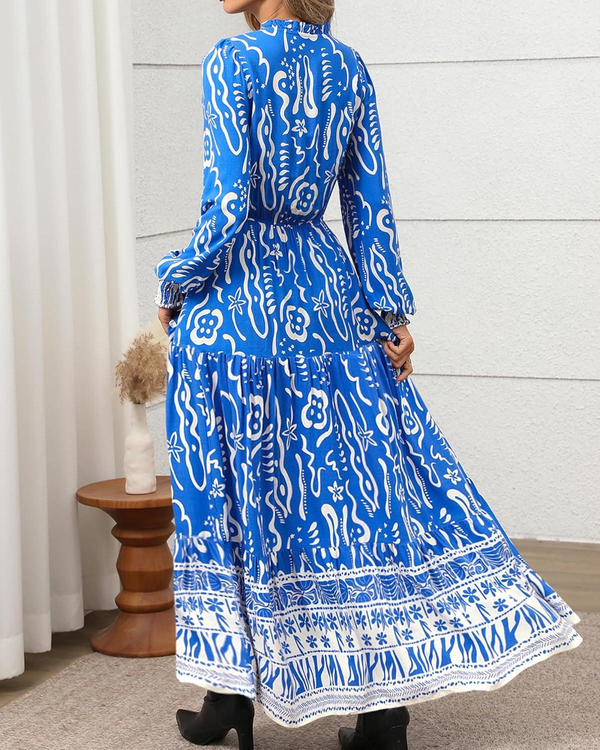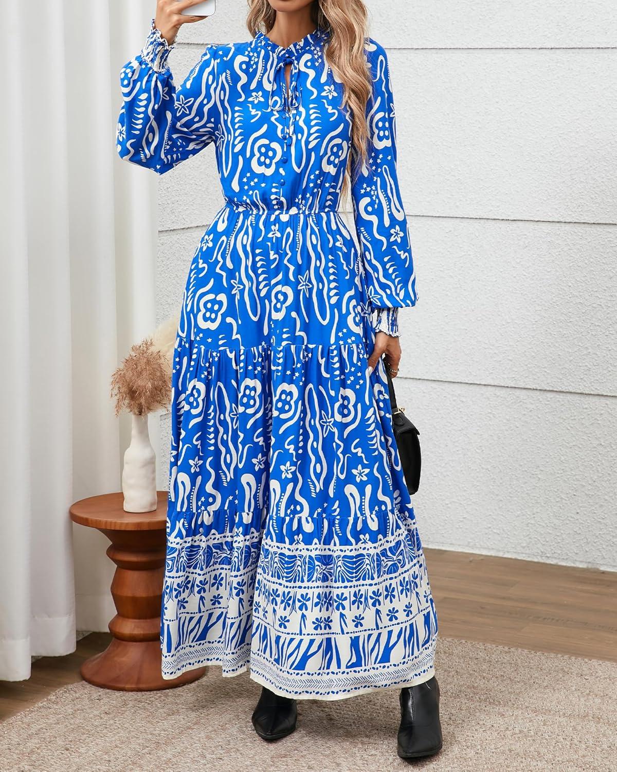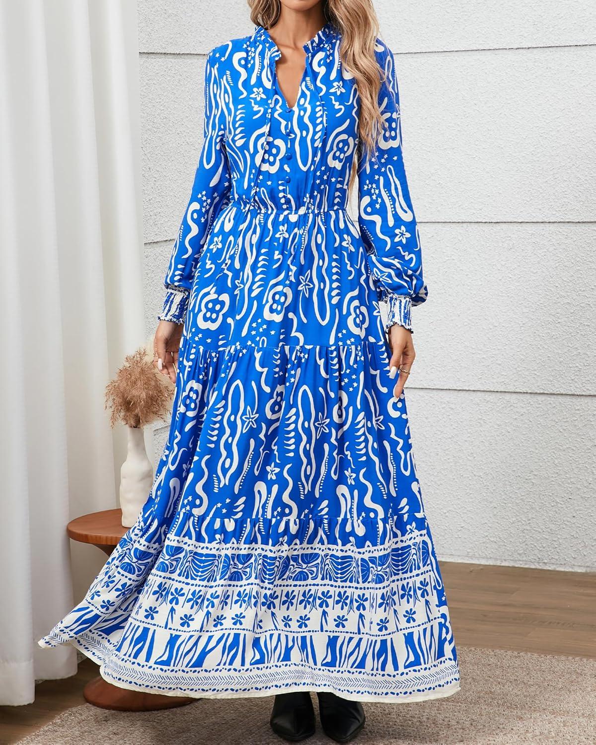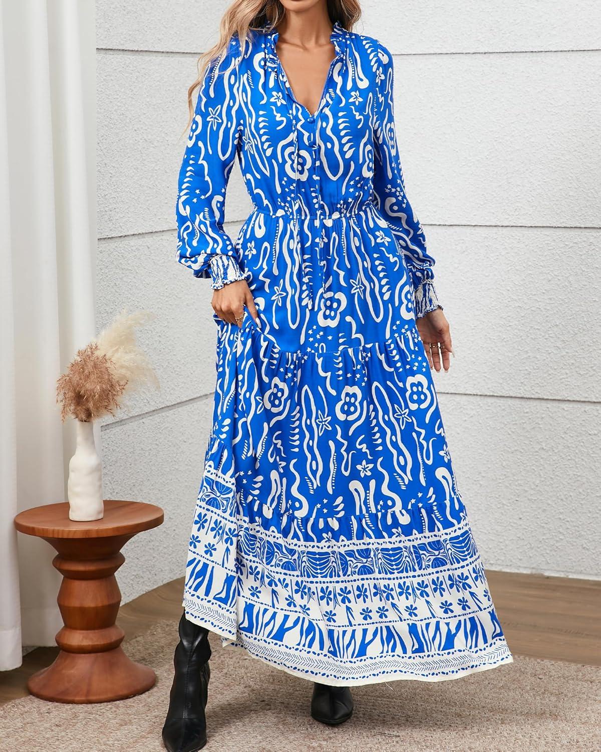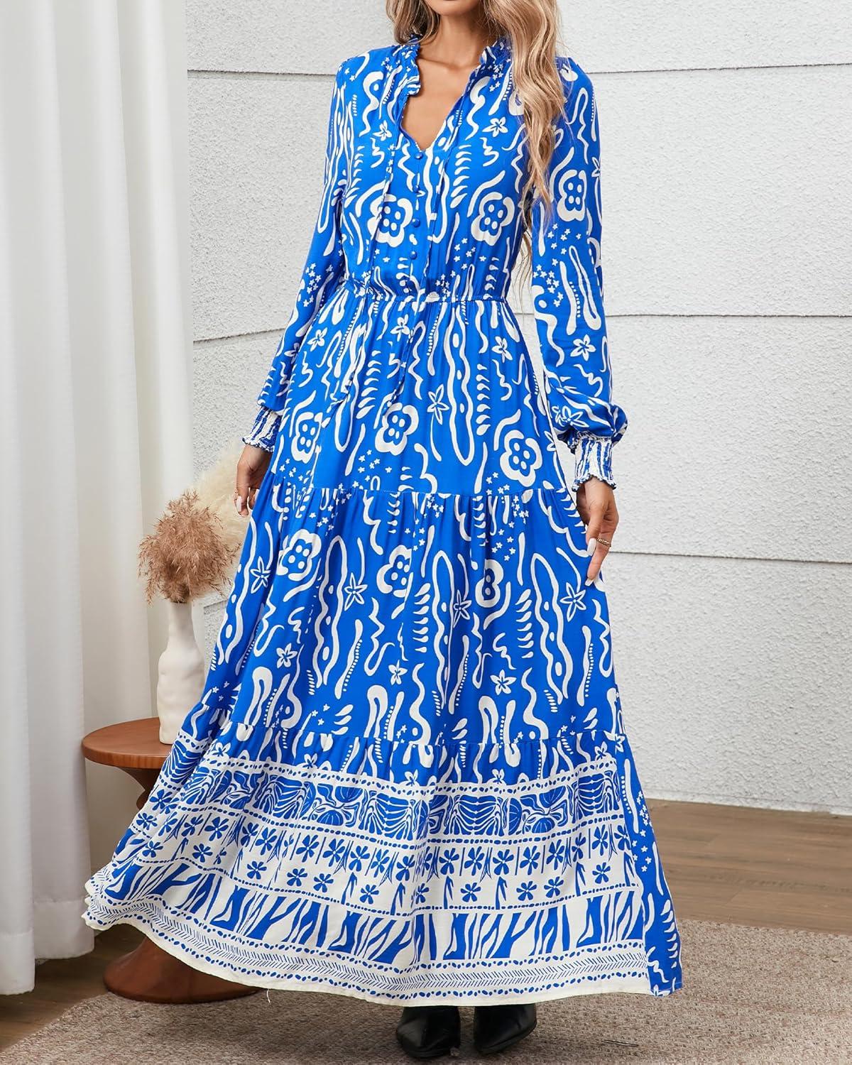 BTFBM Womens Boho Maxi Dress 2025 Casual V Neck Long Sleeve Front Tie Button Flowy Fall Wedding Guest Dresses Pockets(Blue White Flower)