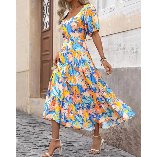 BTFBM Women’s Boho Summer Dresses Short Sleeve Floral Print Smocked Tie Back Tiered A-Line Flowy Cruise Vacation Dress(Multicolored Blue)