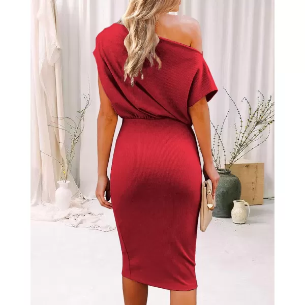 BTFBM Women's Casual Party Dresses 2023 Summer Spring Off The Shoulder Short Sleeve Slim Ribbed Knit Midi Bodycon Dress(Solid Red)