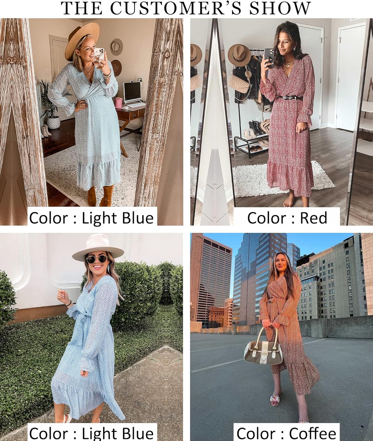 FASHIONABLE DESIGN : Womens Dresses / Casual Dresses For Women / Long Sleeve Dresses / Boho Dress / Charming Deep V Neck / V Line End With A Safety Button / Long Sleeve With Cute Ruffle Cuffs Design / Flowy Swing Pleated Skirt Hem / Delicate Floral Printed / Fit And Flare A- Line Dress / Below The Knee And Above Ankle Length / Comfort Midi Length / Soft And Airy Fabric / Tie Waist / Elastic Band At The Waist / Romantic, Playful, Bohemian Style / For Spring, Summer, Fall / Size: S, M, L, XL