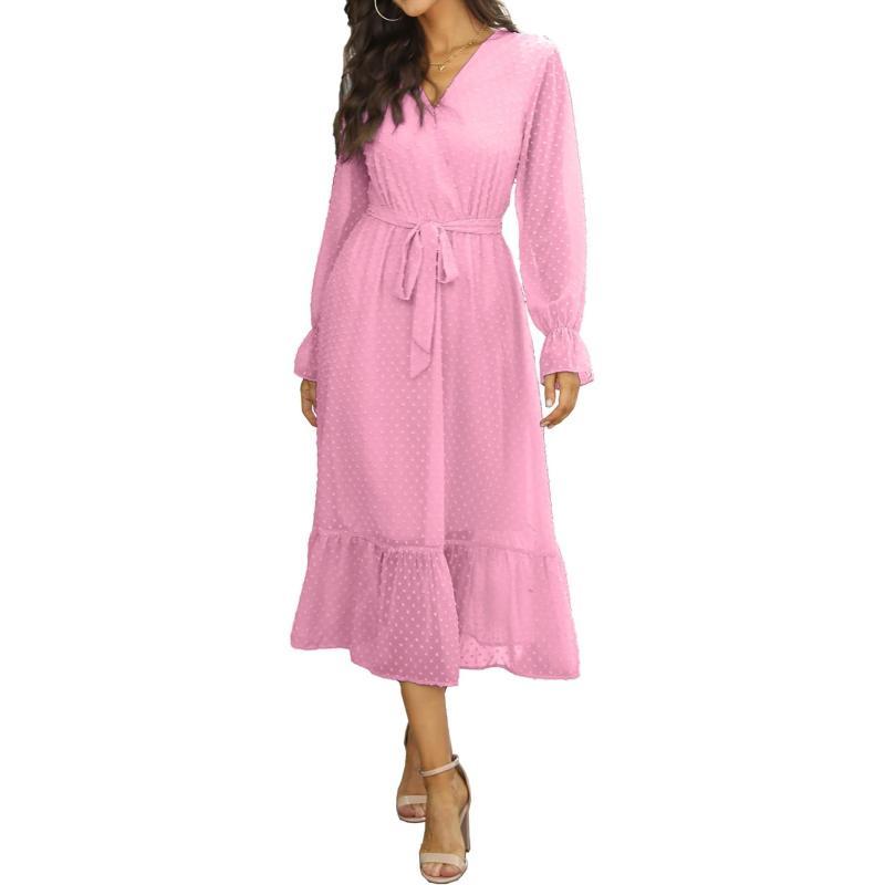 BTFBM Women's Casual Party Summer Fall Dresses 2023 Long Sleeve Wrap V Neck Swiss Dot Swing A-Line Maxi Dress with Belt(Swiss Dot Rose Pink)