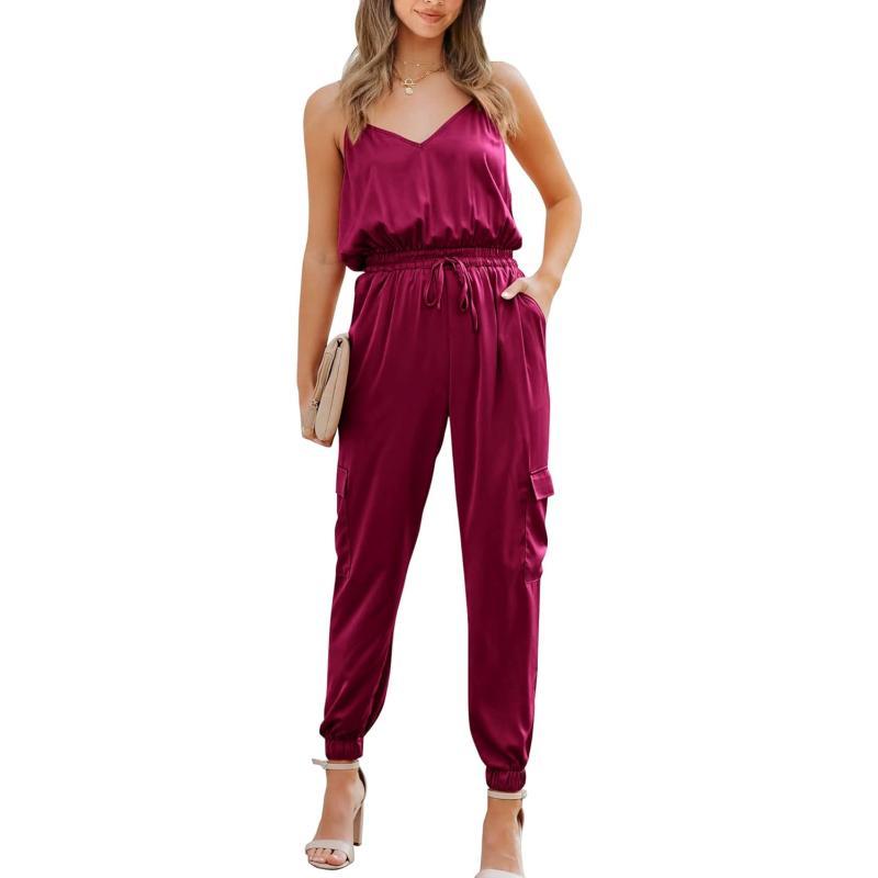 FEATURES: S=US 4-6, M=US 8-10, L=US 12-14, XL=US 16-18 / Satin Women's Jumpsuits, Rompers & Overalls / One Piece Outfits / Deep V Neck / Sleeveless Adjustable Spaghetti Strap / Adjustable Drawstring Elastic Waist / High Waist Long Pants / Two Side Slash Pockets And Side Flap Pockets / Elastic Beam Foot / Solid Color / Satin Fabric