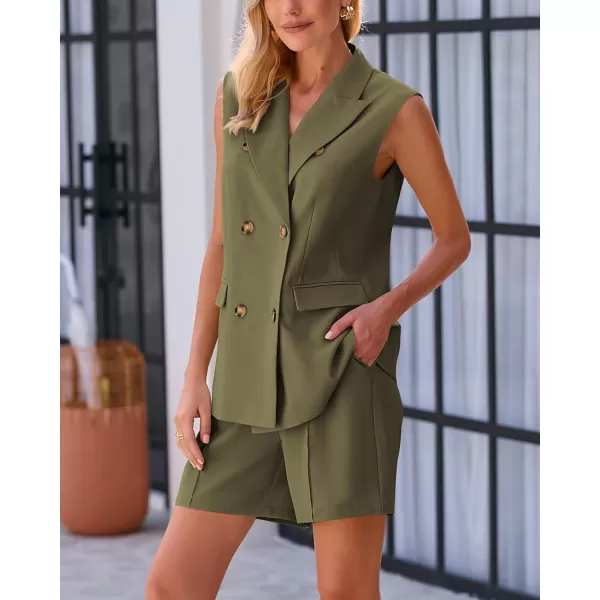 BTFBM Women's Casual Sleeveless Blazer Vest Shorts Sets Notched Lapel Double Breasted Office Two Piece Matching Outfits(Solid Army Green)