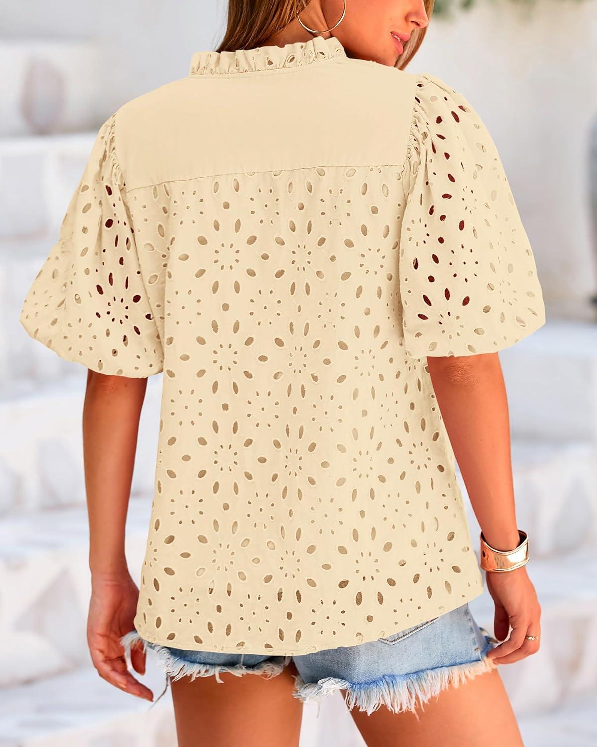 Get your hands on our newest BTFBM Womens Casual Summer Blouse 2025 Hollow Out Eyelet Embroidery Tops V Neck Buttons Puff Short Sleeve Boho Shirts(Solid Beige) and enjoy a limited-time discount offer.