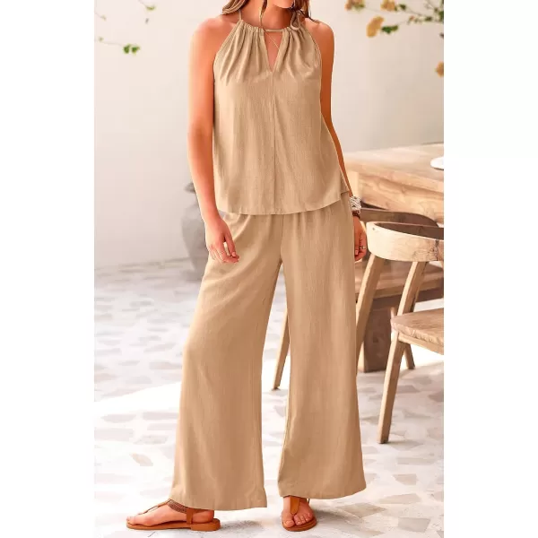 imageBTFBM Womens Casual Summer Two Piece Outfits Cotton Linen Sets Cutout Halter Sleeveless Top Wide Leg Pants Matching SetSolid Khaki