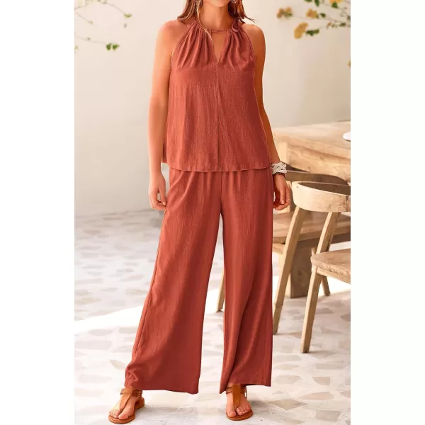 imageBTFBM Womens Casual Summer Two Piece Outfits Cotton Linen Sets Cutout Halter Sleeveless Top Wide Leg Pants Matching SetSolid Rust Red