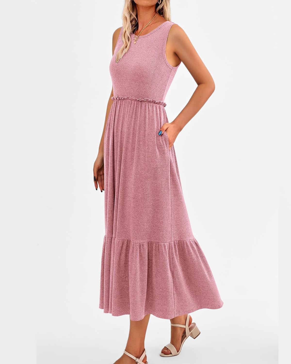 imageBTFBM Womens Casual Tank Dress Crewneck Boho Summer Sleeveless Sundress Ruffle Tiered Cocktail Midi Dresses with PocketsSolid Pink